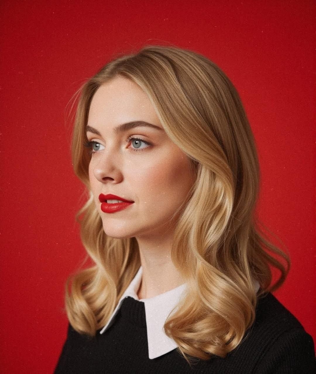 "Elegant Portrait Against Red Backdrop"